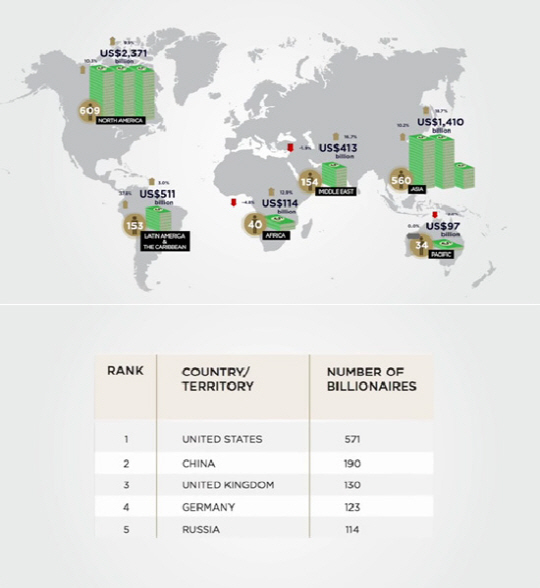 조사 결과 올해 한국의 억만장자 수는 21명으로, 지난해보다 2명 줄어들었으며 억만장자 수 순위는 지난해 21위에서 23위로 하락했다.
