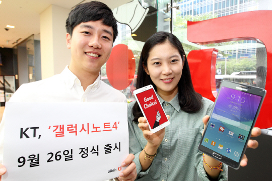 KT(회장 황창규)가 26일 삼성전자의 플래그쉽 모델 '갤럭시노트4'를 전국 올레매장과 온라인 올레샵(shop.olleh.com)을 통해 출시한다고 밝혔다.