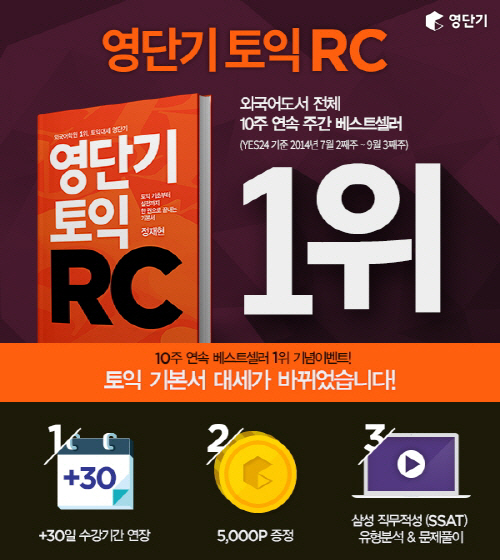 영단기는 토익교재 '영단기 토익RC'가 외국어도서 전체 10주 연속 1위에(예스24기준, 7월 2째주~9월 3째주) 선정됨에 따라 삼성 직무적성(SSAT)특강 및 수강 기간 30일 연장 등 고객들에게 다양한 혜택을 제공한다.