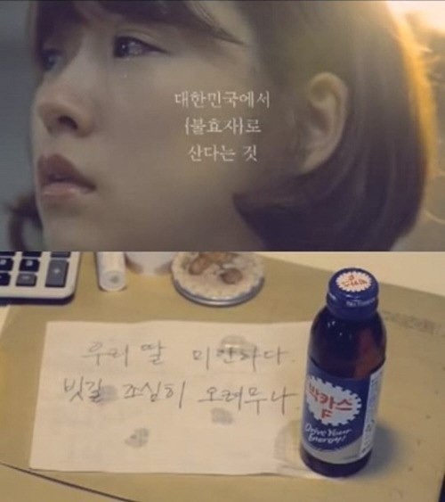 박카스 광고 영상 속에는 비 오는 날 출근하던 딸은 회사 엘리베이터에서 택배기사로 일하는 아버지와 만나는 내용이다. 이들과 함께 엘리베이터를 탄 사람들이 아버지의 초라한 행색과 땀 냄새에 고개를 돌리자 딸마저 창피해 외면했고, 아버지 역시 딸을 아는 척하지 않는다.
