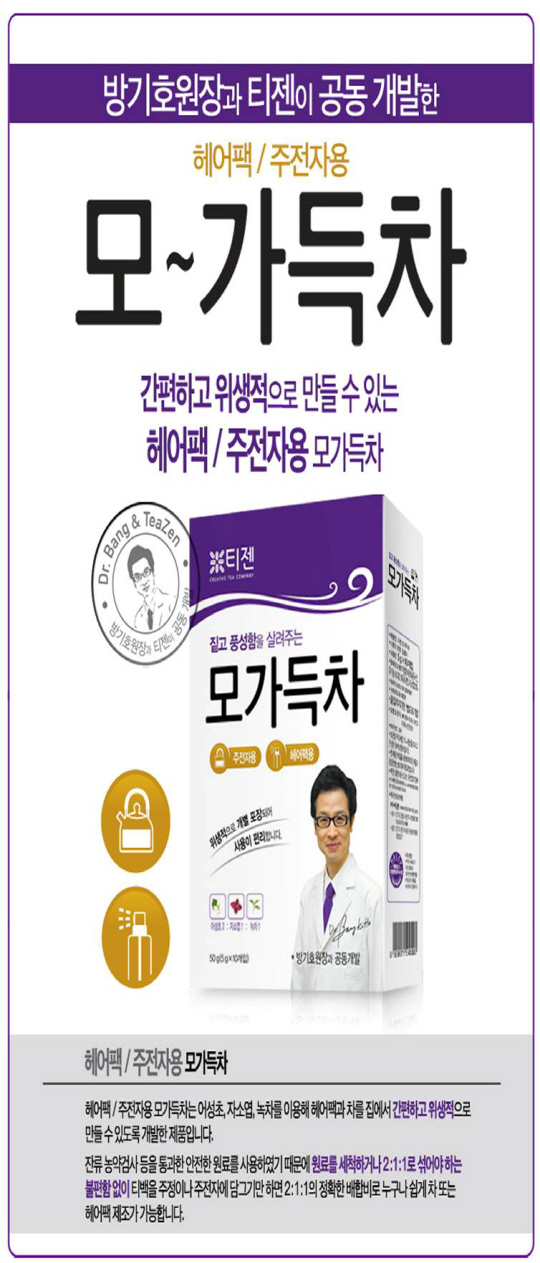모가득차는 종편채널 MBN '엄지의 제왕'에 출연해 탈모에 좋은 발모차, 발모팩을 소개하며 이슈가 된 방기호 원장과 기능성 차 전문업체 티젠(www.teazenmall.com)이 공동개발한 제품이다. 모가득차는 방기호 원장이 특허 출원한 트리플엔자임 콤플렉스(어성초,자소엽,녹차 2:1:1비율 배합)를 적용했으며 손쉽게 음용 할 수 있는 티백 형태와 헤어팩(헤어스프레이)을 제조할 수 있도록 2종류로 출시됐다.
