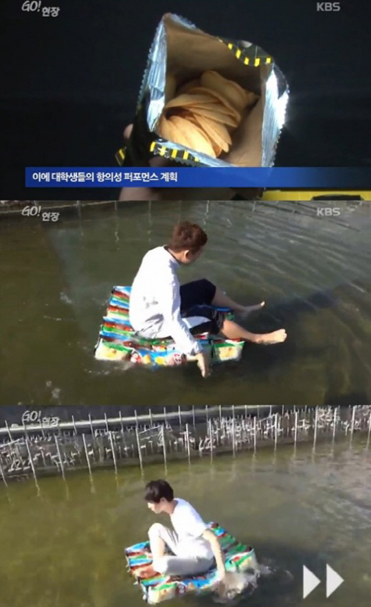 앞서 이 대학생들은 온라인 커뮤니티에 과자 60봉지를 이어 붙여 만든 시제품 뗏목에 올라탄 채 얕은 물을 건너는 동영상을 올려 화제를 모은 바 있다.