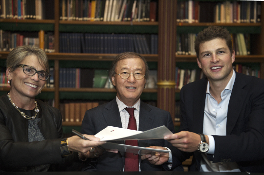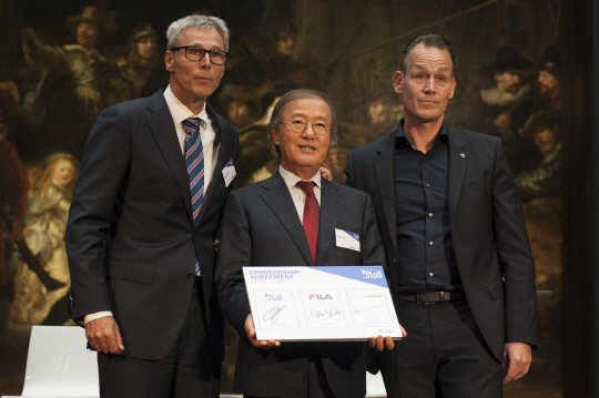 휠라 윤윤수 회장이 네덜란드 빙상연맹과 후원협약식을 체결하고 기념촬영하고 있다. 왼쪽부터 에리 쿱스 네덜란드 빙상연맹 스포츠디렉터, 휠라 윤윤수 회장, 스포츠컴펙스 버트 반 더 툭 스포츠컴펙스사 대표.
