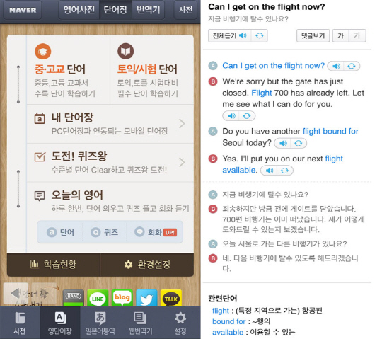 모바일 네이버 사전에서 사용할 수 있는 영어와 일본어 단어장은 외국어를 더욱 다양하게 학습할 수 있도록 '오늘의 회화', '도전! 퀴즈왕', '오늘의 퀴즈' 등을 제공하고 있다.