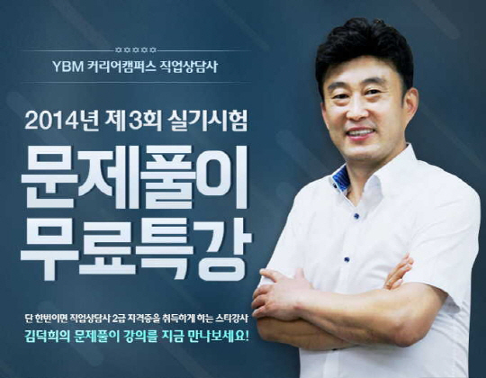 커리어캠퍼스는 제3회 직업상담사 2급 자격증 실기시험이 치러지는 5일 당일 오후 11시에 홈페이지(www.ybmcc.com)에서 문제풀이 무료특강을 진행한다. 이번 특강은 김덕희 커리어캠퍼스 전임강사가 시험의 정답을 설명하고 출제경향, 난이도, 신 유형 등을 집중 분석해 설명한다. 김덕희 강사는 고용노동부 전국 강의평가에서 1위를 차지한 바 있는 베테랑 강사로 올 상반기에 천안여성인력개발센터 직업상담사 시험반 수강생 전원을 1·2차 시험에 합격시킨 대표 실력파 강사다.