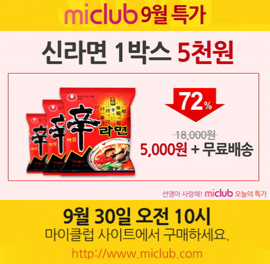 여성포털 사이트 마이클럽은 '오늘의 특가' 서비스를 오픈하고 30일 오전 10시부터 농심 신라면 1박스(20개)를 시중가인 1만8000원 대비 72% 할인된 5000원에 판매한다고 30일 밝혔다.
