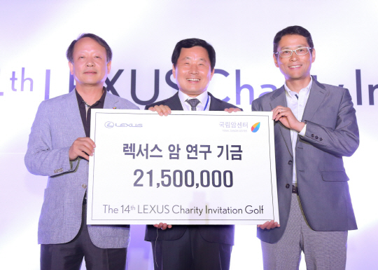 렉서스 브랜드는 지난 28일부터 1박 2일 일정으로 렉서스 고객 200여명이 참석한 가운데 제주도에서 '제14회 렉서스 고객초청 자선 골프대회'를 개최, 고객들의 참가비와 자선바자를 통해 모은 성금을 국립암센터와 아름다운 가게에 기부했다. 사진 왼쪽부터 이강현 국립암센터 원장, 렉서스 고객, 요시다 아키히사 한국토요타자동차 사장.
