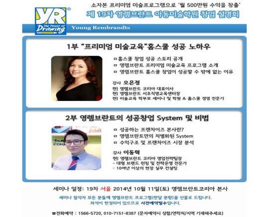 한편, 제19차 창업 설명회의 참석자 전원에게는 영 렘브란트 코리아의 프리미엄 미술교육 프로그램 한 달 분량을 선물로 제공한다. 영 렘브란트 코리아의 미술교육 프로그램은 미국 본사 연구진이 20여 년간 진행해온 '미술과 두뇌발달' 연구 결과에 영 렘브란트 코리아 연구진들의 노하우가 더해진 것으로 여타 브랜드와 차별화되는 영 렘브란트만의 경쟁력을 확인할 수 있다. 영 렘브란트 코리아 창업 설명회는 무료이며 한정된 좌석으로 선착순 사전 예약을 받는다. 사전 예약이나 문의는 전화(1566-5720)로 가능하다.
