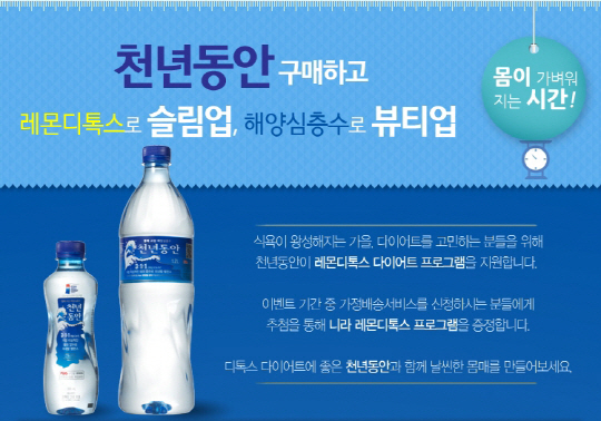 ㈜강원심층수가 프리미엄 해양심층수 '천년동안' 구매 고객을 대상으로 레몬 디톡스 다이어트 제품을 증정하는 이벤트를 실시한다.