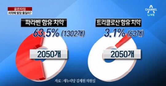 앞서 5일 국회 보건복지위원회 소속 김재원 새누리당 의원이 식약처로부터 제출받은 국정감사 자료에 따르면, 시판되는 치약의 60% 이상이 국내외 다양한 연구에서 인체유해성분으로 판정 받은 '파라벤'과 '트리클로산'이 포함된 제품인 것으로 드러나 논란이 일었다.