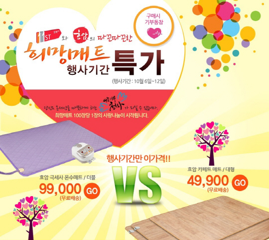 SK플래닛 오픈마켓 11번가(www.11st.co.kr)는 대한적십자사와 함께 온열매트를 구매하면 자동으로 기부에 동참할 수 있는 '11번가&효암 희망매트' 기획전을 12일까지 진행한다. 기획전을 통해 '효암 온열 매트'가 100장 판매될 때마다 1장은 대한적십자사에 전달돼 청소년 가정, 노인가구, 다문화 가족, 북한이탈주민 등 도움이 필요한 곳에 기부될 예정이다.