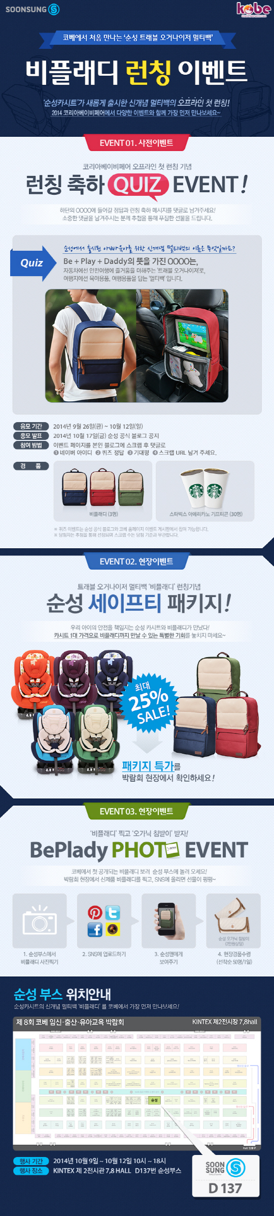 8회를 맞이하는 코리아베이비페어는 국내외 250여 개 업체가 참여하는 만큼 다양하고 푸짐한 이벤트로 유명하다. 이번 행사에서 순성산업은 카시트 1대 가격으로 트래블 오거나이저 멀티백인 '비플래디'까지 만날 수 있는 순성 세이프티 패키지를 최대 25%할인된 가격으로 현장 이벤트를 진행한다.