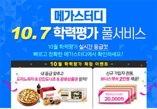 국내 최대의 교육기업 메가스터디(www.megastudy.net/대표 손성은)가 고3 학생들을 대상으로 7일 저녁부터 10월 모의고사(10월 학력평가) 등급컷 서비스를 온라인과 모바일을 통해 가장 빠르게 무료로 제공한다고 밝혔다.
