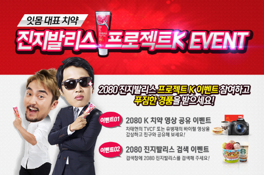 진지발리스 프로젝트 K 온라인 이벤트는 영상공유 이벤트, 검색 이벤트 등 2가지로 31일까지 진행된다. 먼저 영상공유 이벤트는 2080홈페이지(http://2080.aekyung.co.kr)에서 차태현 TV CF 또는 유병재의 바이럴 영상을 친구와 공유하면 응모 가능하다. 31일까지 응모한 사람 중 추첨을 통해 80만원 상당의 디지털카메라(1명), 2인 영화 예매권(50명), 던킨도너츠 기프티콘(70명) 등을 증정한다. 당첨 결과는 11월 7일 2080홈페이지에서 발표한다.