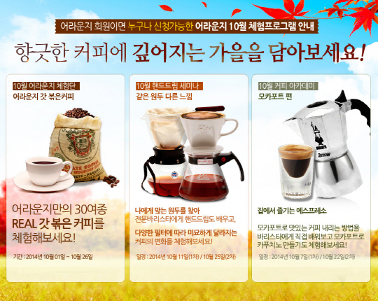커피유통 전문 브랜드 어라운지(ArounZ)가 깊어가는 가을을 맞아 10월 커피 체험 프로그램을 진행한다.