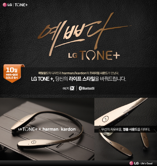 LG TONE+ 블루투스 헤드셋은 LG전자의 대표적인 스마트 액세서리다. 지난 8일 판매를 시작한HBS-900 GOLD 모델을 살펴보면 기존 HSB-900 SILVER 모델에서 보다 고급스러운 GOLD 컬러로 한층 업그레이드 되었다. 헤드셋의 기본인 음질, 착용감 모두 우수하다. 명품 오디오 브랜드 '하만 카돈'의 사운드 시스템을 적용하여 뛰어난 음질을 즐길 수 있다. 기존의 형상 기억합금 넥밴드 타입의 디자인을 한 단계 업그레이드 함으로써 뒷부분만 벌어져 착용감을 한층 강화한 제품이다. 주요 기능으로는 BT Reader+ 가 있다. 스마트폰과 HBS-900을 블루투스로 연결하면 문자메시지, SNS, 메신저 내용을 음성으로 읽어준다. 이외에도 14시간 지속되는 배터리, 스마트폰으로 부터 8M 이상 벗어나면 진동으로 알려주는 분실방지 기능 등이 있다.