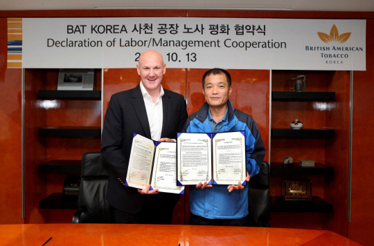 브리티쉬 아메리칸 토바코 코리아(이하 BAT 코리아)와 BAT코리아 사천공장 노동조합은 양자간 협력관계를 도모하고 향후 3년간 노사간의 무분규로 유지하는데 동의했다. BAT 코리아 가이 멜드럼(Guy Meldrum) 사장과