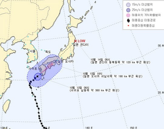 13일 기상청은 "'봉퐁'이 북상함에 따라 제주도와 경상도 해안, 강원도 영동을 중심으로 시간당 30mm 내외의 강한 비가 내리는 곳이 있겠다"고 밝혔다.