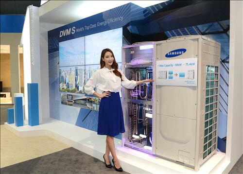◇삼성전자 모델이 14일 삼성동 COEX에서 열린 '2014 대한민국 에너지대전'서 세계 최대 수준 용량(75.4kW(26마력))의 '시스템에어컨 대용량 DVM S'를 소개하고 있다.