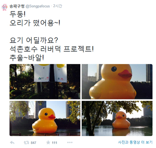 석촌호수 러버덕, 오늘(14일)부터 한 달간 전시 "두둥, 오리가 떴어요"