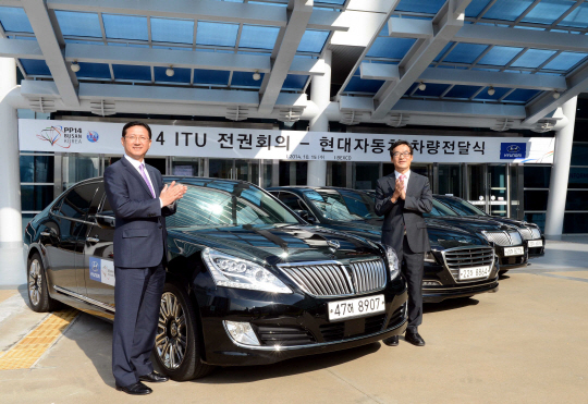 현대차는 15일 부산 벡스코에서 현대차 이봉주 이사, ITU 전권회의 준비기획단 이상학 부단장 등 관계자들이 참석한 가운데 차량지원 협약식과 전달식을 가졌다.