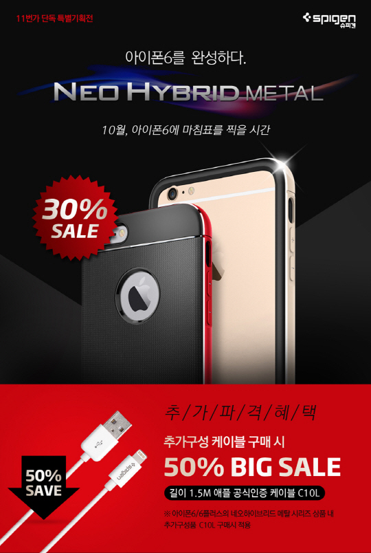 아이폰6 메탈 케이스 기획전은 아이폰6용 케이스 '네오하이브리드 메탈'과 '네오하이브리드EX 메탈' 시리즈를 30% 할인된 가격으로 구매할 수 있는 행사다. 애플공식인증을 받은 슈피겐의 충전 케이블 'C10L'을 추가구성으로 구매 시 해당 제품에 50% 할인 혜택도 제공한다.