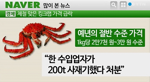 또한 송파구 가락시장 등 여러 수산시장에서도 킹크랩 소매 가격이 평소보다 싼 1kg당 3~4만원에 거래된 것으로 알려졌다.