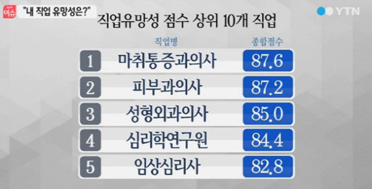 2위는 피부과 의사(87.2점) 3위는 성형외과 의사(85.0점), 심리학연구원(84.4점), 임상심리사(82.8점) 순이었다.
