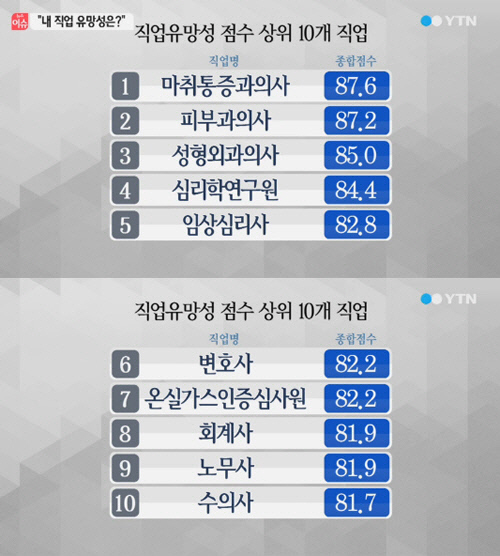 2위는 피부과 의사(87.2점) 3위는 성형외과 의사(85.0점), 심리학연구원(84.4점), 임상심리사(82.8점)들이 일자리 증가와 발전 가능성, 고용안정성에서 높은 점수를 줬다.
