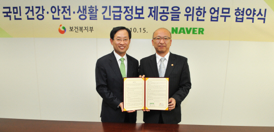 네이버㈜(대표이사 사장 김상헌)와 보건복지부(장관 문형표)가 16일 국민 건강 및 안전과 직결되거나 위협이 될 만큼의 긴급상황 발생 시 신속한 정보 제공을 위한 업무협약을 체결했다고 밝혔다.