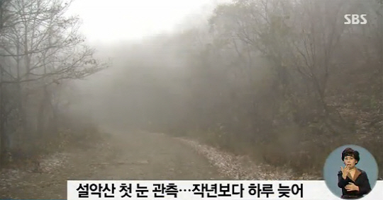 올가을 설악산의 첫눈은 작년보다 하루 늦은 것이다.