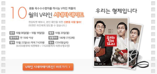 광동제약의 'V라인 시네마데이트'가 이번에 함께할 영화는 장진 감독의 신작 '우리는 형제입니다'이다. 어린 시절 고아원에서 헤어진 후 30년 만에 상봉한 두 형제가 30분 만에 사라진 엄마를 찾으면서 형제애를 되찾아가는 코미디 영화로 장진 감독이 메가폰을 잡고, 충무로 대세 배우 조진웅과 김성균이 주연으로 출연하여 기대를 모은다.