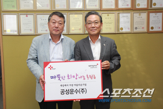 | ◇지난 8월 8일 공성운수(주) 심재선 대표이사(왼쪽)가 구호 희망풍차 후원금을 전달하고 있다. |