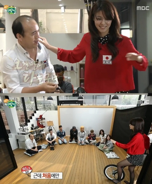 이날 '헬로 이방인'에서 후지이 미나는 자신의 장기로 외발 자전거 실력을 뽐냈다. 특히 후지이 미나는 짧은 바지를 입고 외발 자전거를 타며 매끈한 각선미를 과시했다.