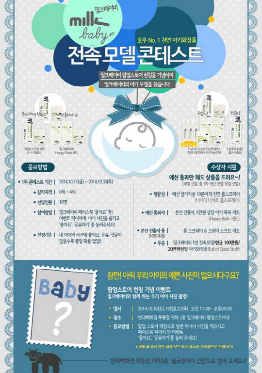 유아 브랜드 (주)맥밀크가 호주산 천연 유아화장품 '밀크베이비'의 전속 모델로 1년간 활동할 아기모델 선발대회를 개최한다.