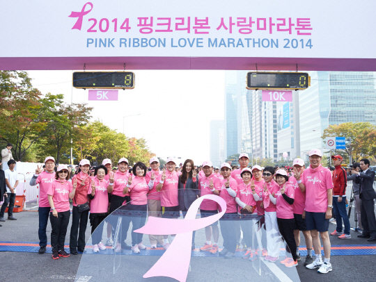 유방건강에 관한 유용한 정보를 제공하고, 자가 검진의 중요성을 알리기 위해 아모레퍼시픽(대표이사 서경배)이 주관하고 한국유방건강재단(이사장 노동영)이 주최한 '2014 핑크리본 사랑마라톤 서울대회'가 19일 오전 서울 여의도공원에서 성황리에 개최됐다.