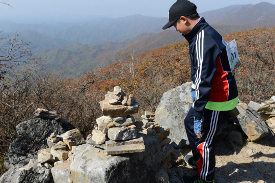 트레킹코스 도중 돌탑쌓기 도전에 나선 초등학생 참가자. 정선=김형우 여행전문 기자