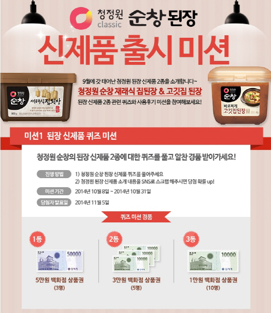 이러한 신제품 출시를 기념해 10월 31일까지 청정원 자연주부단이면 누구나 쉽게 참여할 수 있는 퀴즈 미션 이벤트를 진행한다. 청정원 사이트 이벤트 페이지에서 이번 된장 신제품 2종에 대한 간단한 퀴즈 두 가지를 풀면 응모가 완료된다. 이때 이벤트 내용을 개인 SNS나 커뮤니티 등에 스크랩 하면 당첨 확률을 높일 수 있다. 응모자 중 1등 3명을 뽑아 백화점 상품권 5만원을, 2등 5명과 3등 10명에게는 각각 백화점 상품권 3만원, 1만원을 지급한다.