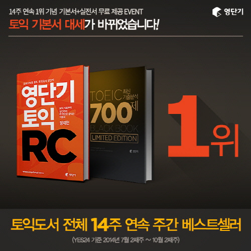 영단기(대표 윤성혁, 이정진)는 토익교재 '영단기 토익RC'가 토익 분야 14주 연속 1위(예스24기준, 7월 2째주~10월 2째주)에 오른 것을 기념해 27일(월)까지 영단기 '실전 모의고사 700제'를 무료로 증정한다.