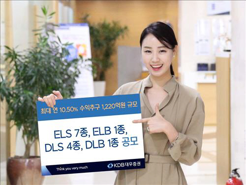 KDB대우증권은 21일부터 주가연계증권(ELS) 7종, 주가연계파생결합사채(ELB) 1종, 파생결합증권(DLS) 4종, 기타파생결합사채(DLB) 1종 등 모두 13종의 상품을 1220억원 규모로 판매한다고 밝혔다.