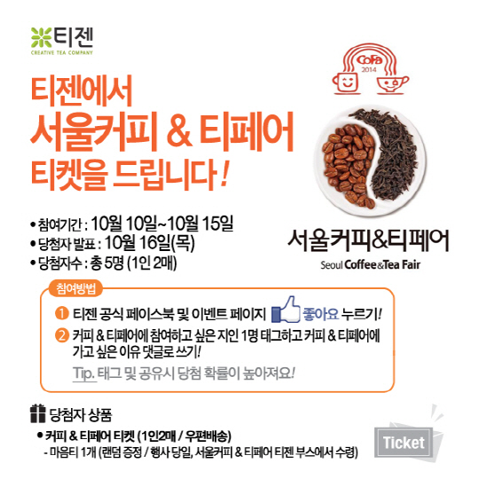 2014 서울커피&티페어는 국내 커피·차 산업과 카페문화의 발전 및 대중화를 위한 열린 장터다. 티젠은 이번 전시회에서 다이어트·노화방지에 좋은 '우엉차', 디자인 특허를 받은 감성 디자인티 '마음티', 탈모 전문의 방기호 원장과 공동 개발한 신제품 '모가득차' 등 자사만의 다양한 제품군을 선보이며 적극적인 브랜드 홍보에 나선다.
