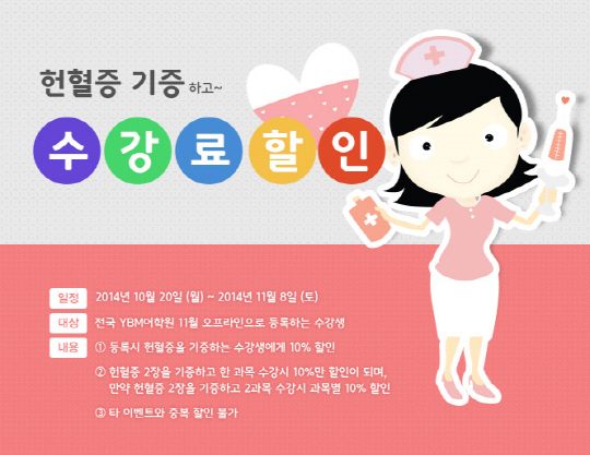 YBM어학원(ybmedu.com)은 전 지점 11월 수강 등록생을 대상으로 헌혈증 기부 캠페인 및 이벤트를 11월 8일까지 진행한다. 11월 수강 등록 시 헌혈증서를 두 장 기부하면 두 과목 수강 시 수강료를 최대 20% 할인해 준다. 전국 YBM어학원 센터에서 참여 가능하다. 2004년 시작한 이래 11년째 이어오고 있는 YBM어학원의 대표적인 사회공헌 캠페인의 일환이다.