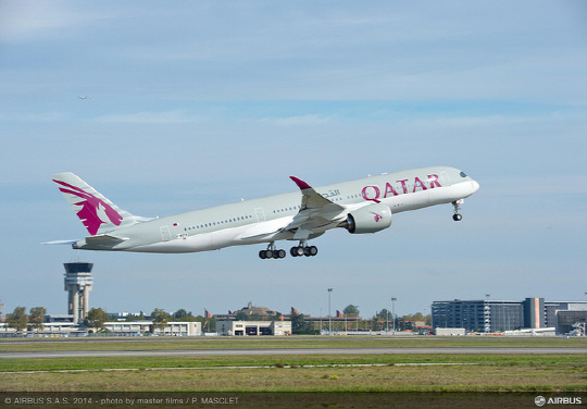 카타르항공이 21일 에어버스 본사가 있는 프랑스 툴루즈에서 카타르항공의 로고와 상징색으로 도색을 마친 'A350 XWB(Extra Wide Body)' 1호기의 시범비행을 성공적으로 마쳤다고 밝혔다.