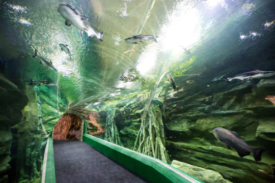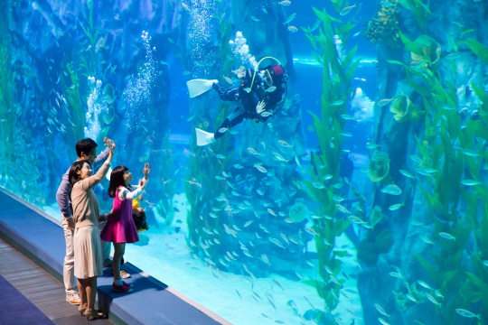 서울 잠실 제2롯데월드 저층부 롯데월드몰이 최근 차례로 문을 열었다. 초고층 타워를 제외하고 연면적 42만 8934㎡(12만 9753평) 규모의 롯데월드몰 중 대표적 테마파크 아이템은 '아쿠아리움'. 롯데월드가 개장 25년 만에 서울에 선보인 새로운 어뮤즈먼트 파크다. 잠실 제2롯데월드 엔터테인먼트 동에 위치한 아쿠아리움의 규모는 매머드급이다. 지하 두 개 층 수족관의 연면적은 축구장 1.5개 크기. 650종의 강과 바다 생물 5만5000여 마리가 13개 테마로 전시 중이다. 관람 동선 850m를 걷는 데는 두 시간이 족히 걸린다. 국내 도심 수족관 중에서는 가장 크다. 코엑스 아쿠아리움의 2배, 63빌딩 수족관의 7배에 해당된다.