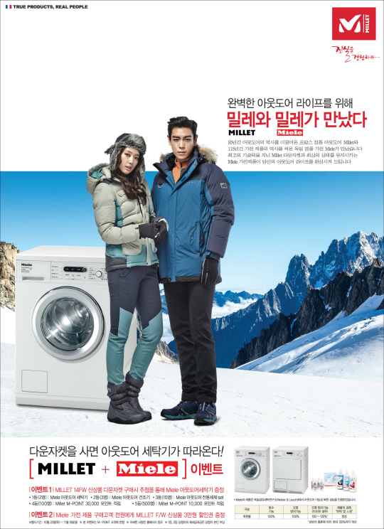 아웃도어 브랜드 밀레(㈜MEH, 대표 한철호)가 독일 프리미엄 가전 브랜드 '밀레'(대표 안규문)와 공동 마케팅을 진행하며 '밀레(Millet) + 밀레(Miele)' 이벤트를 실시한다.