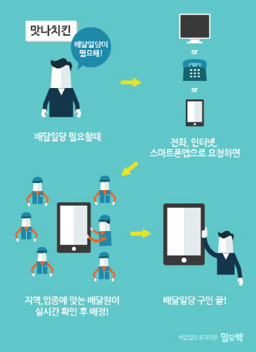 구인구직도 모바일로 편하게 하게 할 수 있게 됐다. 일당백 앱을 통해서다. 일당백은 인력수급을 원하는 업체와 일일근로를 원하는 인력을 실시간 앱을 통해 매칭시켜주는 실시간 인력중개 앱 서비스다. 인력사무실에서 전화로 인력을 중개하던 기존방식과는 달리, 스마트폰을 중심으로 업소와 인력간 중개를 대행하고 있는 실시간 일당중개 통합솔루션을 제공한다.