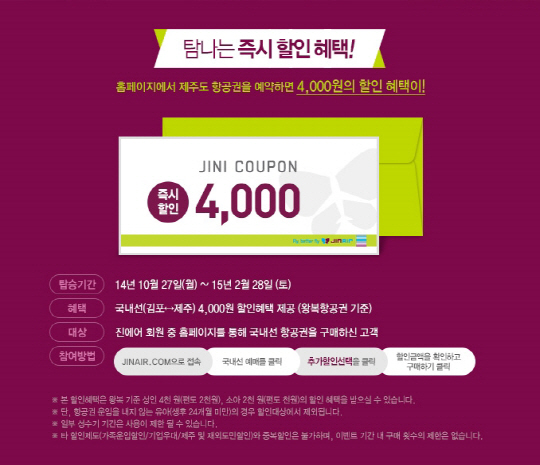 진에어 홈페이지 회원이라면 해당 기간 중 진에어 홈페이지에 로그인해 10월 27일(월)부터 내년 2월 28일(토) 사이의 김포-제주 노선을 예매 시 추가 할인 선택 메뉴에 활성화되는 즉시 할인 쿠폰을 적용해 탑승객 수만큼 바로 할인을 받을 수 있으며, 성인은 왕복 4천원(편도 구매 시 2천원), 소아는 왕복 2천원(편도 구매 시 1천원)의 할인 혜택을 받을 수 있다. 특히 이번 행사 적용을 통한 예매에는 개인별 횟수 제한이 없으며, 별도로 기 보유한 국내선 할인 쿠폰이 있다면 해당 쿠폰과도 중복 추가 할인이 가능한 것이 특징이다.