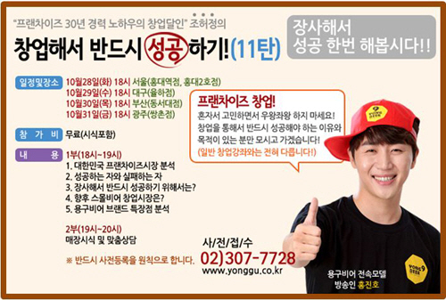 10월28일(화) 저녁 6시 서울 홍대역점(홍대2호점)을 시작으로 29일(수) 대구 율하점, 30일(목) 부산 동서대점, 31일(금) 광주 쌍촌점에서 진행하는 이번 용구비어의 창업설명회는 스몰비어 창업에 대한 여러 가지 궁금증과 더불어 용구비어 매장 컨셉과 다양한 메뉴를 알아볼 수 있는 좋은 기회가 될 것이다.