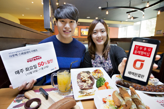 KT(회장 황창규)가 국내 대표 패밀리 레스토랑인 '아웃백 스테이크하우스'(이하 '아웃백')와 함께 '결제금액 최대 50% 할인'이라는 파격적인 이벤트를 선보인다.