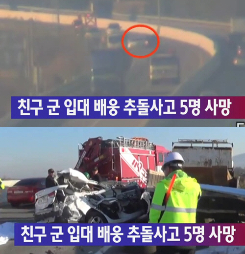 사고 당시 폐쇄회로(CC) TV에는 김씨가 앞서 가던 스포티지 승용차를 추월하려다가 차가 균형을 잃고 2차로를 벗어나 트럭을 들이받는 장면이 잡혔다.